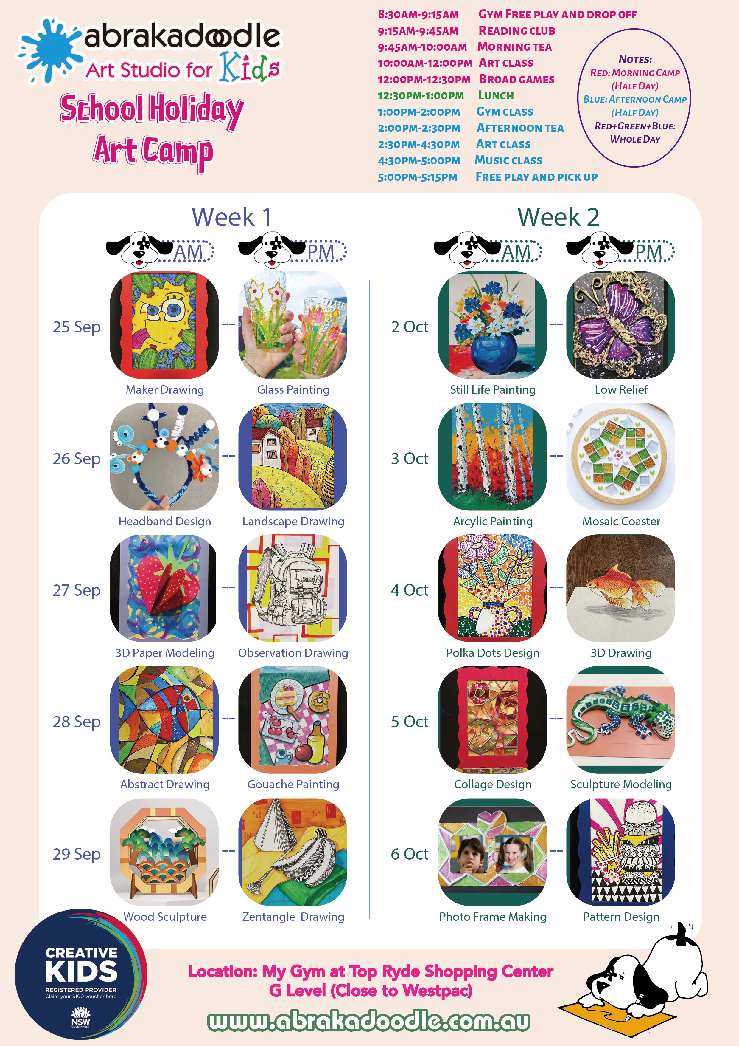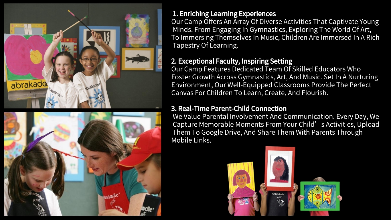 Enriching experiences await at our school holiday camp. Expertly guided, children enjoy tailored gymnastics, art, and music classes. Their creativity blossoms with artwork to take home, and we keep you connected through daily photos and videos shared via mobile links. With a nurturing environment and skilled instructors, your child’s growth and joy are paramount. Join us for a holiday where exploration and creativity flourish!
